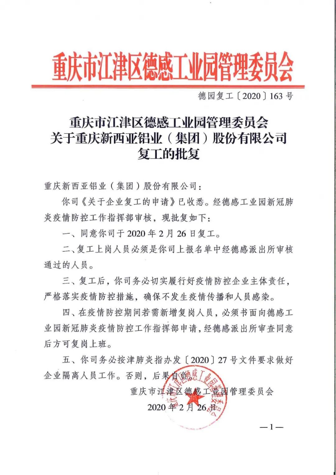 根據(jù)重慶市江津區(qū)《工業(yè)企業(yè)開工復(fù)工辦法》有關(guān)規(guī)定,結(jié)合公司生產(chǎn)經(jīng)營(yíng)實(shí)際,本著“兩手抓兩不誤”的原則,重慶新西亞鋁業(yè)(集團(tuán))股份有限公司于2020年2月26日獲批正式復(fù)工,為了積極應(yīng)對(duì)疫情防控與生產(chǎn)恢復(fù),公司正全力推動(dòng)各項(xiàng)工作。