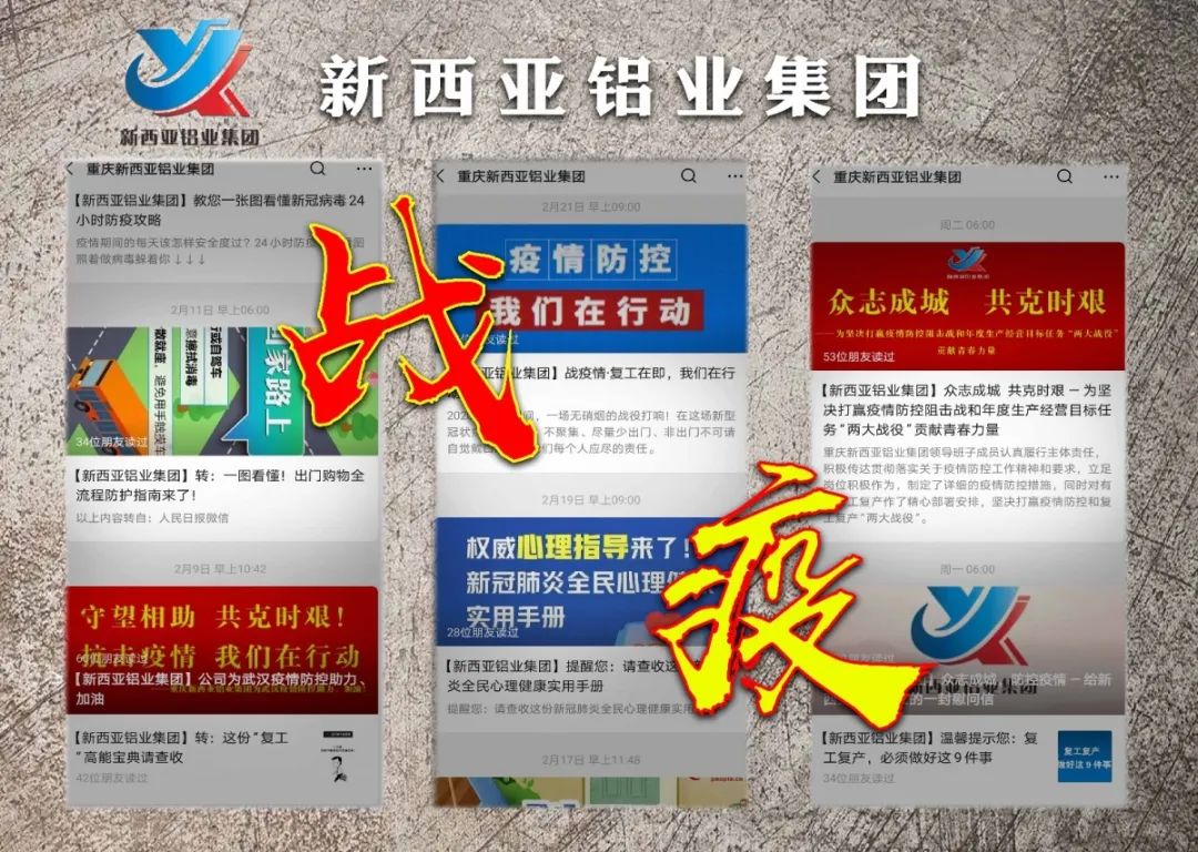 疫情就是命令,防控就是責(zé)任。自疫情發(fā)生以來(lái),重慶新西亞鋁業(yè)集團(tuán)第一時(shí)間成立了疫情防控工作領(lǐng)導(dǎo)小組,研究、部署、動(dòng)員、落實(shí)新冠肺炎疫情防控工作,要求把公司全體員工的身體健康和生命安全放在第一位。防控工作領(lǐng)導(dǎo)小組組長(zhǎng)由公司黨支部書記、總經(jīng)理劉斌擔(dān)任。疫情復(fù)工前夕,為了讓全體員工有危機(jī)意識(shí)、自我保護(hù)意識(shí)和利他意識(shí),公司疫情防控小組利用微信群、QQ群、微信公眾號(hào)等方式積極開展、落實(shí)關(guān)于疫情防控工作的有關(guān)精神和要求并詳細(xì)制定相關(guān)措施,引導(dǎo)全體員工通過(guò)“平安江津”查詢生活軌跡,為堅(jiān)決打贏疫情防控和復(fù)工復(fù)產(chǎn)作精心施策和準(zhǔn)備。