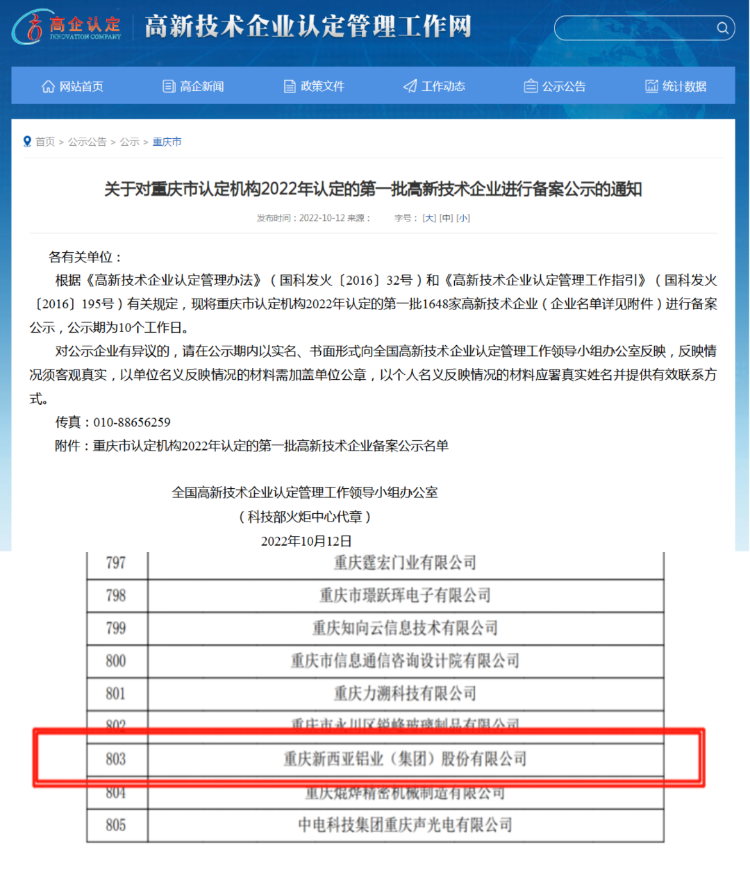 2022年10月12日,根據(jù)《高新技術企業(yè)認定管理辦法》(國科發(fā)火〔2016〕32號)和《高新技術企業(yè)認定管理工作指引》(國科發(fā)火〔2016〕195號)有關規(guī)定,高新技術企業(yè)認定管理工作網(wǎng)對2022年度重慶市第一批擬認定高新技術企業(yè)名單進行了公示,我司喜在榜中。這是新西亞鋁業(yè)獲得由國家科技部審核復審認定的“高新技術企業(yè)”稱號。