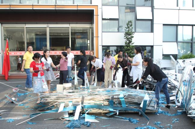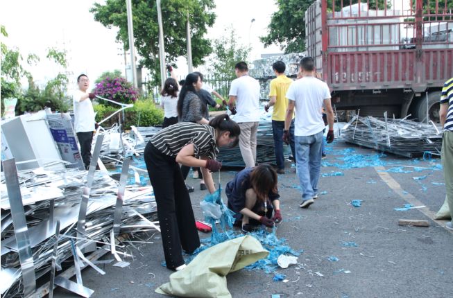 數(shù)月來,公司生產持續(xù)繁忙,每天都將產生大量的邊角余料,這些廢料如不及時處理,將嚴重影響公司正常生產。為此,公司黨支部“急生產所急”,適時組織了這次義務勞動。勞動內容:把粘貼在鋁板邊角余料上的保護膜一塊一塊撕下來,然后進行打包處理。在整個勞動現(xiàn)場,從總經(jīng)理到一般員工,從共產黨員到普通群眾,大家心往一處想、勁往一處使,挽起衣袖,談笑風生,不叫苦不叫累,人人干得汗流浹背、熱火朝天。表現(xiàn)出新西亞人積極樂觀,甘于奉獻的高尚情操。夜色慢慢降臨,參加義務勞動的全體人員越干越歡,穿梭忙碌的身影,伴隨著燈光閃爍,在活動現(xiàn)場形成了一道亮麗的風景線。經(jīng)過兩個半小時的辛勤付出,中庭廣場中堆積如山近20噸的廢鋁邊角余料終于全部清理完畢。