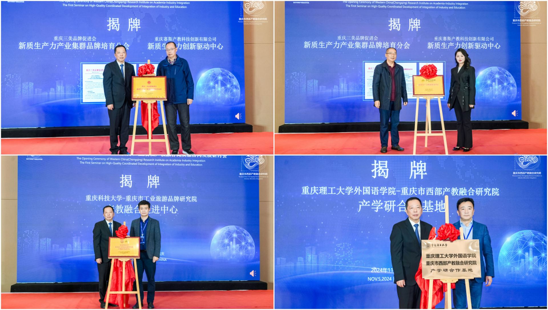 會(huì)議中,研究院與重慶三美品牌促進(jìn)會(huì)、重慶賽斯產(chǎn)教科技創(chuàng)新有限公司、重慶科技大學(xué)-重慶市工業(yè)旅游品牌研究院、重慶理工大學(xué)外國(guó)語(yǔ)學(xué)院等單位舉行了系列揭牌活動(dòng),通過(guò)系列合作成果的達(dá)成,充分發(fā)揮了研究院搭建產(chǎn)教融合、科教融匯、協(xié)同育人的平臺(tái)作用,激活產(chǎn)學(xué)研一體化“強(qiáng)”引擎,為校企合作注入“新”動(dòng)力。