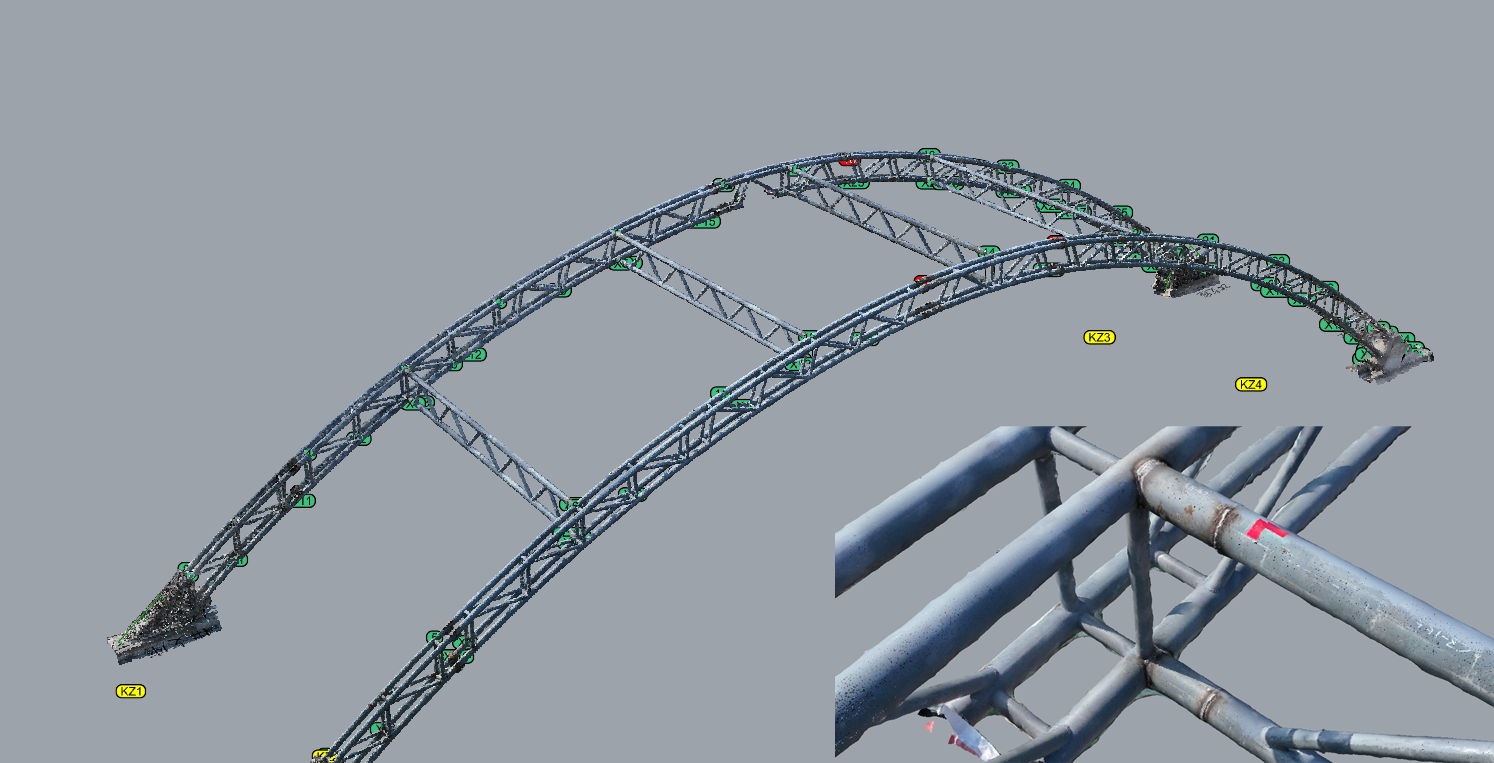 在獲取了可靠現(xiàn)場實(shí)景三維模型后,我們又將其轉(zhuǎn)換為點(diǎn)云模型導(dǎo)入專業(yè)的幕墻建模軟件,開展進(jìn)一步的深化工作。期間通過直觀的三維模型,發(fā)現(xiàn)了因場地限制導(dǎo)致的鋼結(jié)構(gòu)制作偏差,根據(jù)鋼結(jié)構(gòu)實(shí)際形變調(diào)整了原設(shè)計(jì)方案斷面尺寸,并給現(xiàn)場反饋了具體的龍骨制作與控制信息。